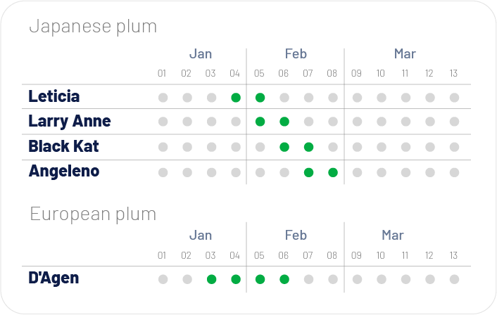 Our 120 hectares of D’Agen plums from the Metropolitan and the O’Higgins region, allow us to export 1. millons kilos to Asia.