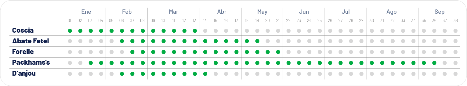 We have 50 hectares of pears produced in the Metropolitan, O’Higgins and Maule regions. The production of 3 millons kilos of this fruit is destined for Europe, North America, Central America and South America.